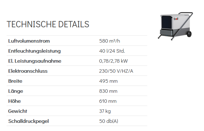 | Ausstattung | Luftentfeuchter/Bautrockner mit Zusatzheizung |