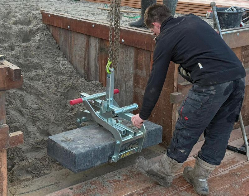 Die AL750-UNI ist die ideale Trittstufenversetzzange für das Greifen und Bewegen von Trittstufen, Randwinkeln, Bordsteinen und vielem mehr. Diese galvanisch verzinkte Universalklemme kann bis zu 750 kg heben. Öffnungsweite 350mm und Greifbereich 50-600mm. Die AL750-UNI kann mit der Umschaltautomatik automatisch entriegelt und verriegelt werden.