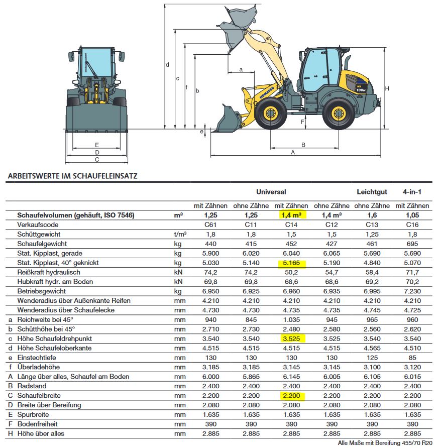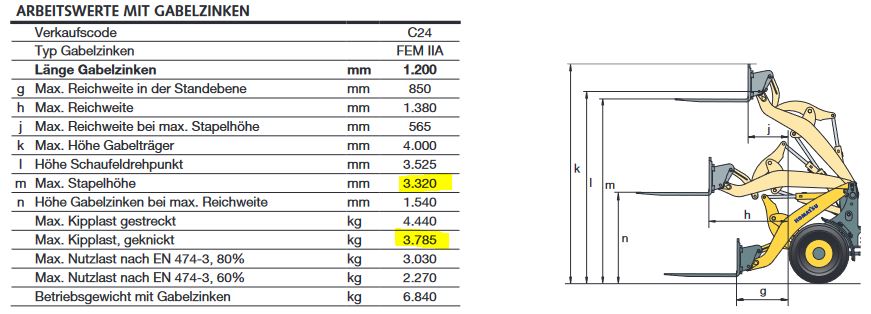 | Gewicht (kg) | Breite (mm) | Höhe (mm) | Länge (mm) | Schaufelinhalt (m³) | Stapelhöhe (mm) | Nutzlast (kg) | Typ | Bezeichnung |