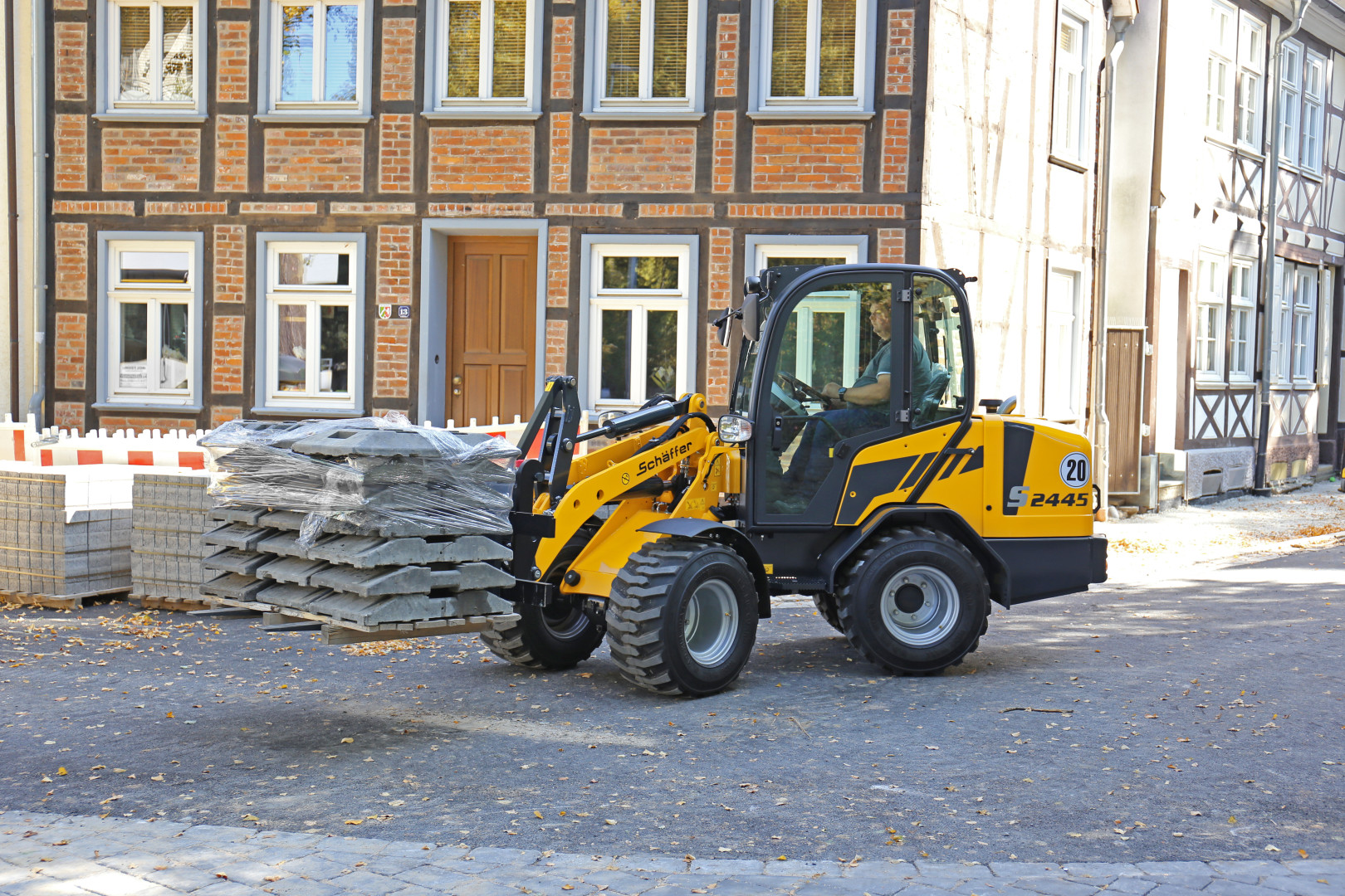 Trotz seiner kompakten Ausmaße ist die Maschine dank einer Kipplast von bis zu 1,9 t in der Lage, ganze Pflastersteinpaletten sicher zu verfahren. Die Hubhöhe beträgt 2,50 m und ist somit ausreichend für das Be- und Entladen auch größerer LKW.